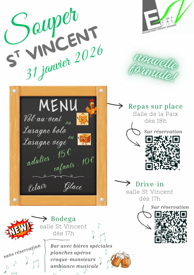 Deux Formules La Formule Drive-in à partir de 17h00 Pour réserver suivez ce lien : Réservation Drive-in La Formule En Présentiel à partir de 18h00: Pour réserver suivez ce lien : Réservation repas en présentiel Juste envie de prendre un verre ! Bodega à la salle Saint-Vincent dès 17h00 (sans réservation) Bar Croque-Monsieur Planche apéritive…