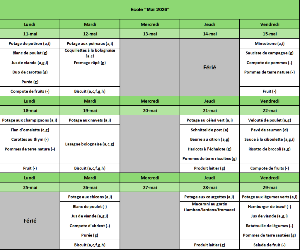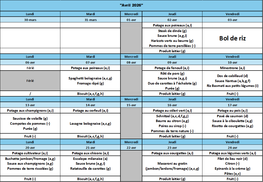 En cas d’absence le repas ne sera annulé que si vous prévenez l’école la veille avant 16h en mentionnant bien l’annulation du ou des repas/soupes. Pas de possibilité d’annuler les repas du lundi si pas fait le vendredi.